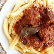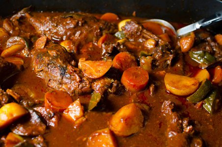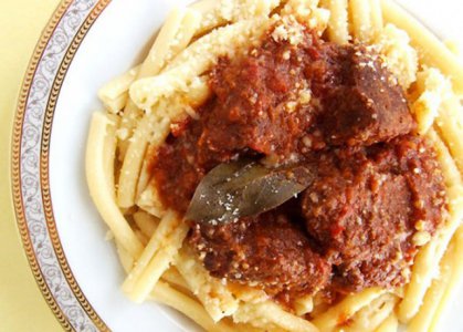 Veal, macaroni, onion, garlic, black pepper, white wine, vinegar, cloves, cinnamon, tomatoes