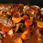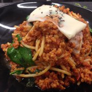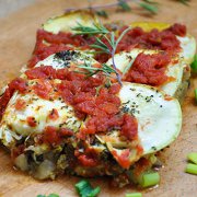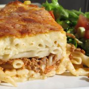Eggplants, lamb, tomatoes, onion, garlic, Béchamel sauce